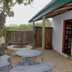 The bedroom, with its double bed made up with crisp, fresh bed linen, offers views onto the paddocks as well as a door leading out onto a cobbled patio. The bathroom offers large fluffy towels, a Victorian-styled bath, a free standing shower, basin and loo. The lounge area also has a door leading out onto the patio as does the kitchen. The lounge consists of a day bed and a wooden pull-out bed, both of which double as sofas. The kitchen offers standard equipment (fridge, 2-plate stove, microwave, kettle and toaster as well as crockery, cutlery and glassware). There isn’t an oven so remember to pack in tin foil to use on either the indoor or outdoor braai. A bag of wood is supplied and additional wood can be purchased from Marna or in town at the OK general store.