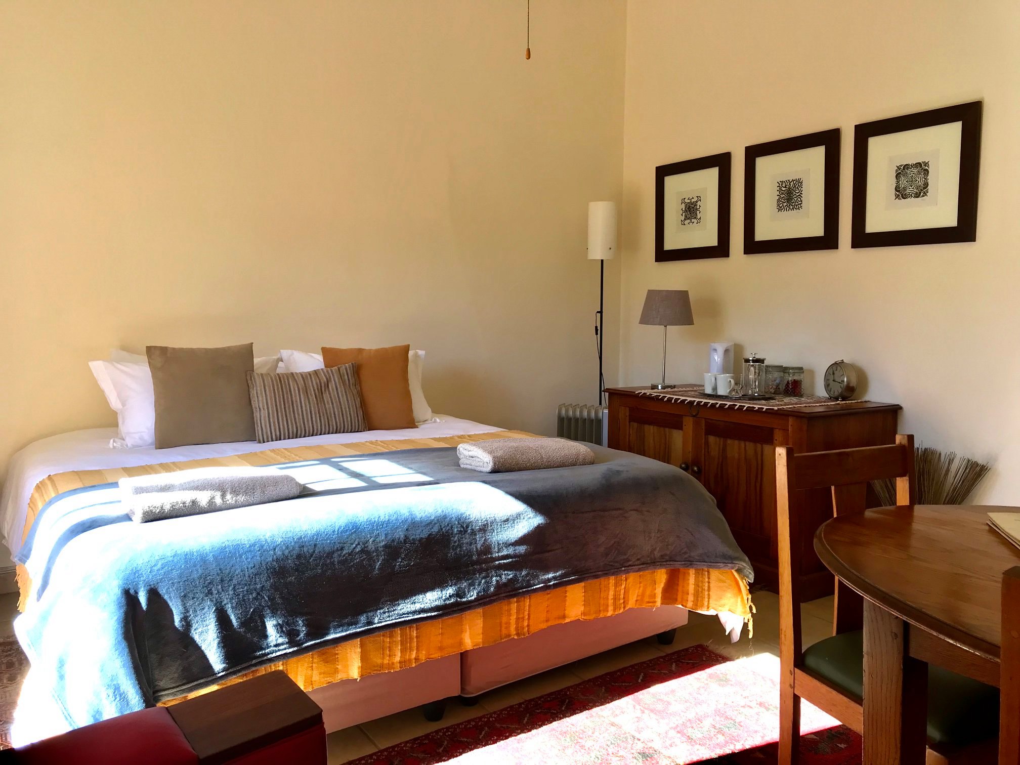 Our five double guest rooms can accommodate two adults each and are simply but beautifully decorated in our own eclectic style and are furnished with  200 thread count white percale linen, fresh towels, free toiletries as well as fans for those hot Karoo days; or blankets, throws and wall heaters for our cold winter’s nights. Plunger coffee and tea comes standard. Even though the rooms are not big they have everything you need to make your stay comfortable.