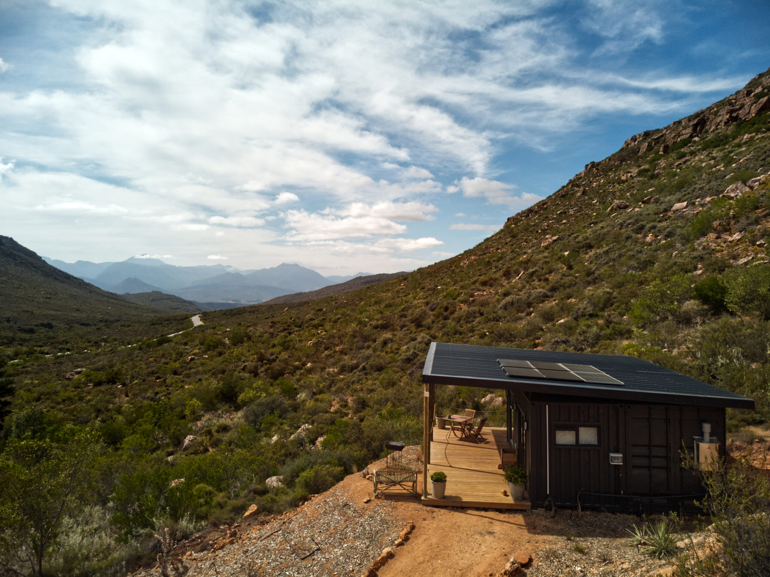 There is a surprising amount of room for two a house made of two upcycled shipping containers. The kitchen was well stocked, only “missing” item was a pair of scissors. We stayed in Verreaux’s Eagle, quiet and stunning views. The firepit and half barrel braai were both lovely. A grid was provided, but it is well weathered so consider bringing your own.