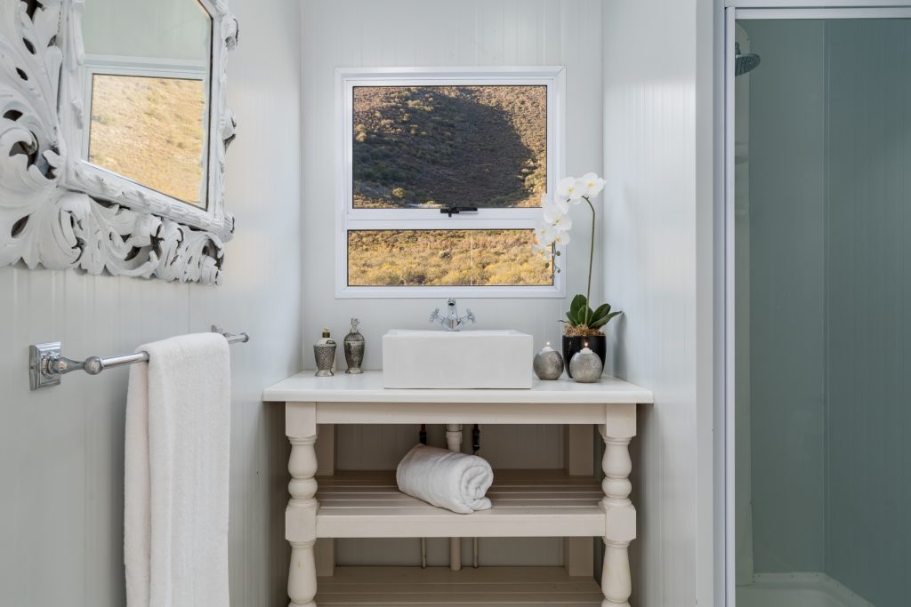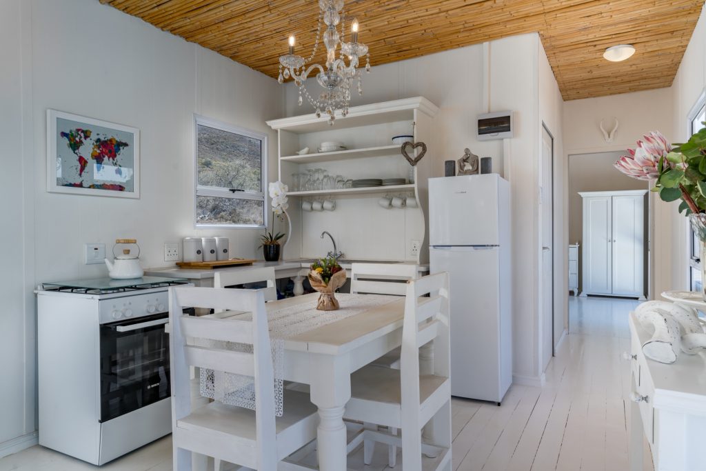 Perfect romantic couple’s or small family retreat. This beautiful off grid, white cabin has stunning 360 nature and mountain views. It sleeps 4 people (2 adults, 2 children. 1 Bedroom, and one Pull-out couch). Open space living area and kitchen with luxurious amenities and design. 1 Bathroom with shower + outside shower. Solar Power and Hot Water Gas Geyser. Wooden deck and lounge chairs outside, with Weber braai and fire pit to enjoy starlit nights. Wood Fired Hot Tub on deck for total relaxation.