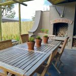 The living areas are made up by a fully-equipped kitchen, and open-plan dining area and a living space warmed by a fire in the cooler months of the year. Open up glass doors onto a wide patio complete with comfortable sitting areas, swings, a sunny daybed and a built-in braai. The cottage is surrounded by private landscaped gardens and a wood-fired pool for your exclusive use.