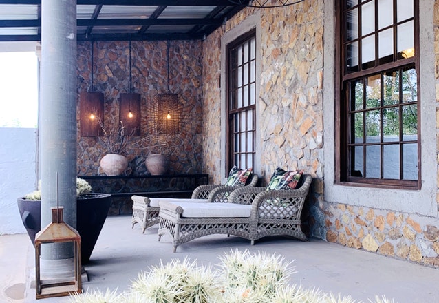 The beautifully furnished living area opens onto a patio with outdoor dining furniture and loungers, the ideal place to relax and enjoy the Karoo sunsets.