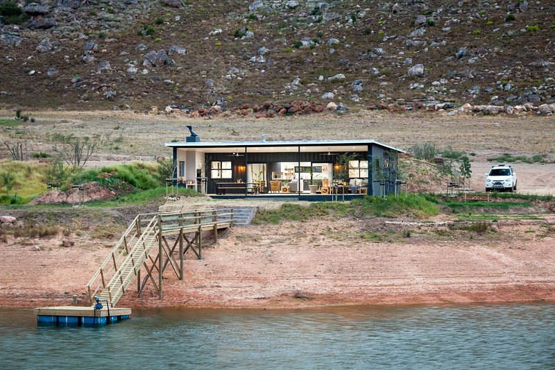 Riverstone’s FamTin offers modern and trendy accommodation for 4, in 2 en-suite rooms. If you’re looking for an escape from the City, to a fabulous farmstay in quirky and contemporary accommodation, FamTin is exactly what you need. Completed in 2018, an eco-build double container conversion, Riverstone’s FamTin is fully equipped for a great self-catering stay. You will find inside and outside dining spaces and lounge areas, a deep covered patio with a built in BBQ, and an economical and efficient wood burning stove inside the central space. Cosy in winter, and with fans throughout to keep cool in summer. FamTin is situated on the farm dam edge, which is perfect for swimming. Uninterrupted views of the gorgeous Mostertshoek Mountains, you can expect pink and orange sunsets every evening. We purposefully have no TV in FamTin, but do offer uncapped wifi. We are proudly pet-friendly too, with an enclosed dog paddock behind the unit and pet-sitting on request. Servicing on request as well.