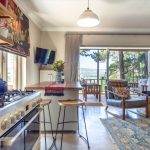 The open-plan living area offers a lounge area and a modern kitchen that is fully equipped to cook up a storm, with facilities such as a fridge-freezer and microwave, a gas stove with an oven as well as built-in cupboards with crockery and cutlery, including other appliances and a table with seating.