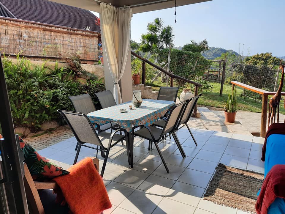Cabana 4 – this is the 2nd family Cabana which is located at Umatmvuna View Cabanas. While situated behind the cabanas at the pool, this is a the biggest Cabana on the premises. There is a private bedroom with ensuite bathroom fitted with air conditioner plus a fan. The kitchen and lounge area are  open plan with flat screen Tv and DSTV ( basic package) with free wifi. Leading from the lounge sliding door is a patio with dining table and a couch. A private braai just for Cabana 4 is located just off the patio.
