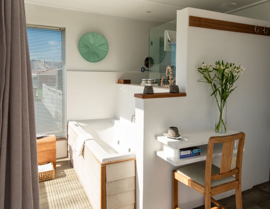 The honeymoon suite is situated at the front of the guesthouse and offers spectacular 180° degree view over Walker Bay. Watch the Southern Right Whales from the comfortable king-size bed or while lying in the spa-bath enjoying a glass of South African bubbles.
